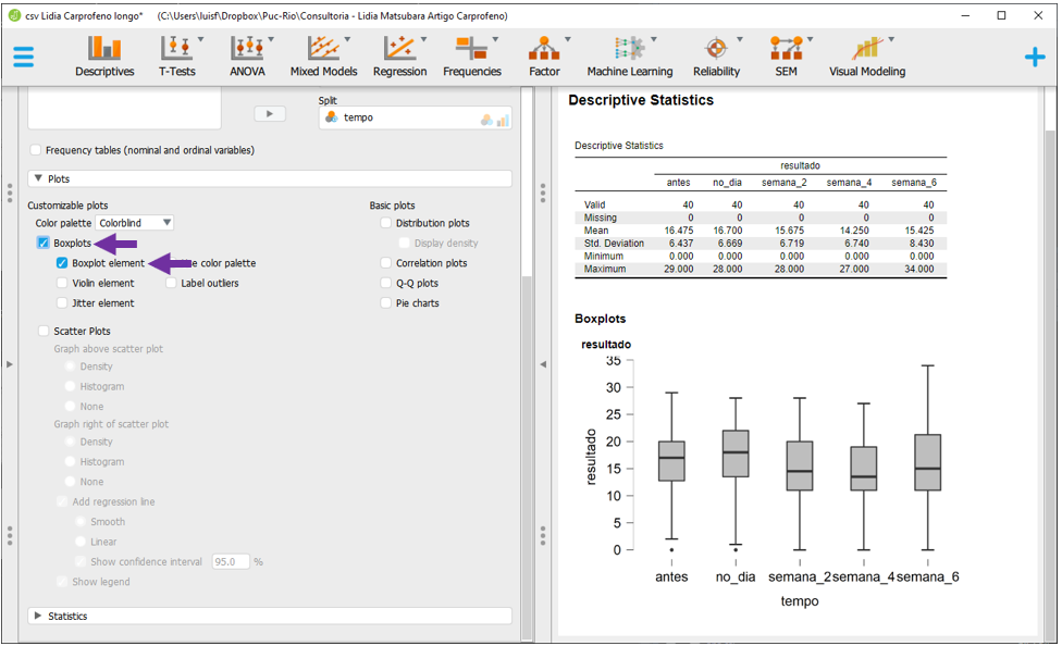 Em seguida, será possível selecionar o Boxplot e Boxplot element. O gráfico aparecerá abaixo da tabela e irá apresentar diferentes informações estatísticas da distribuição dos resultados das variáveis em função do momento da pesquisa.