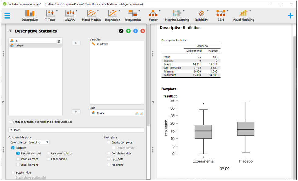 Para gerar as estatísticas descritivas e a apresentação gráfica sobre a relação entre os resultados e os respectivos grupos, será necessário, substituir a variável tempo por grupo no espaço Split.