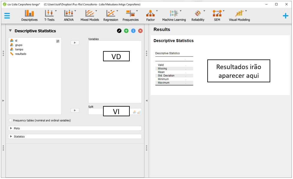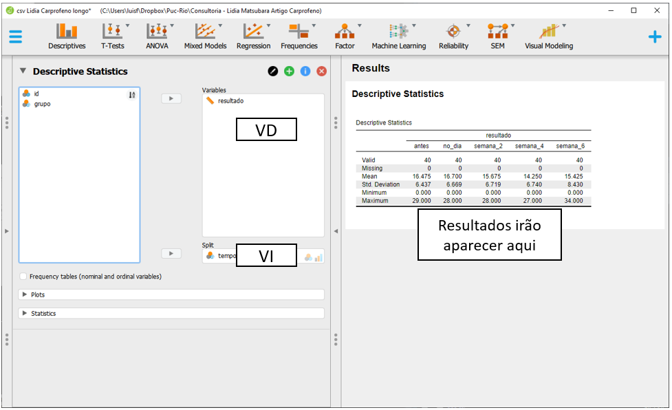 O JASP permite fazer gráficos com apenas 1 agrupador. É possível, então, apresentar inicialmente os resultados pelo tempo e, em seguida, pelo grupo. Para isso, será necessário arrastar a variável tempo para o local de Split e a variável resultado para o local Variables. Ao fazer isso, o JASP irá preencher a tabela com várias informações descritivas.