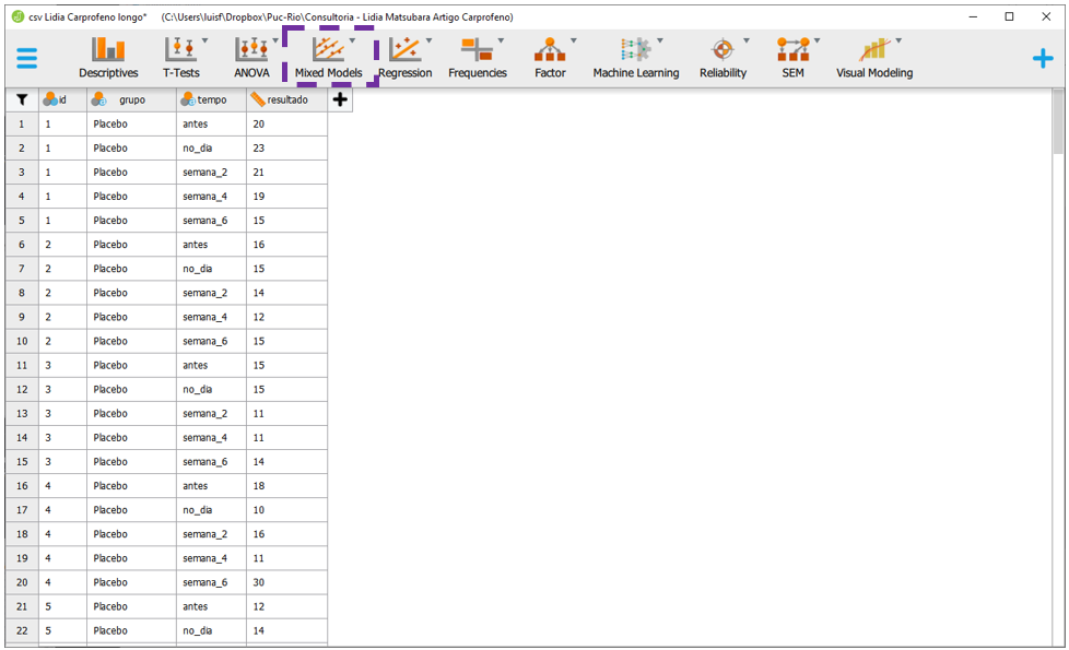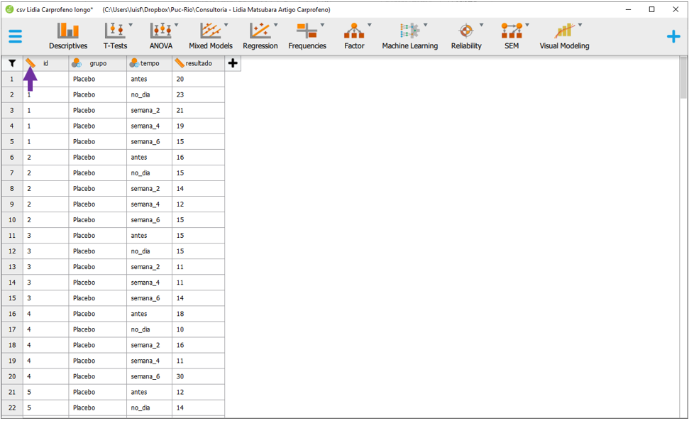 A base utilizada será a intitulada “csv Lidia Carprofeno longo”. Essa base tem o formato longo. Isso significa que os resultados obtidos no decorrer do tempo serão apresentados em cada uma das linhas do conjunto de dados. Modelos Lineares Mistos tendem a solicitar que os dados sejam organizados desta maneira.