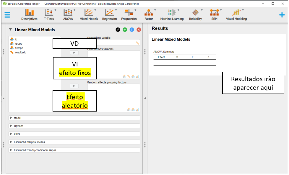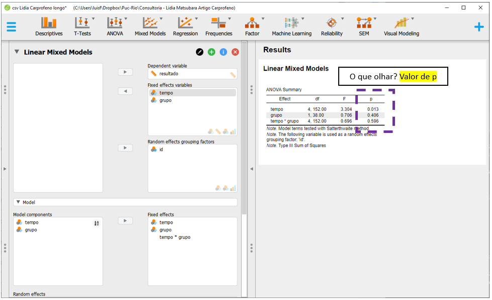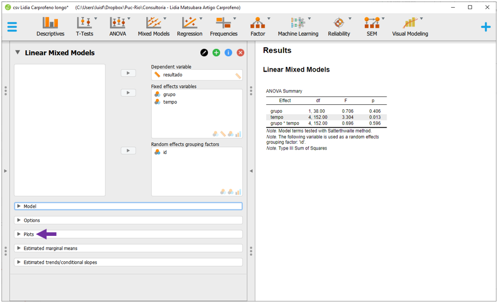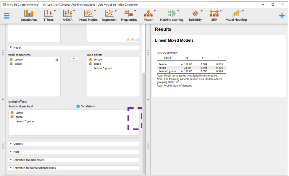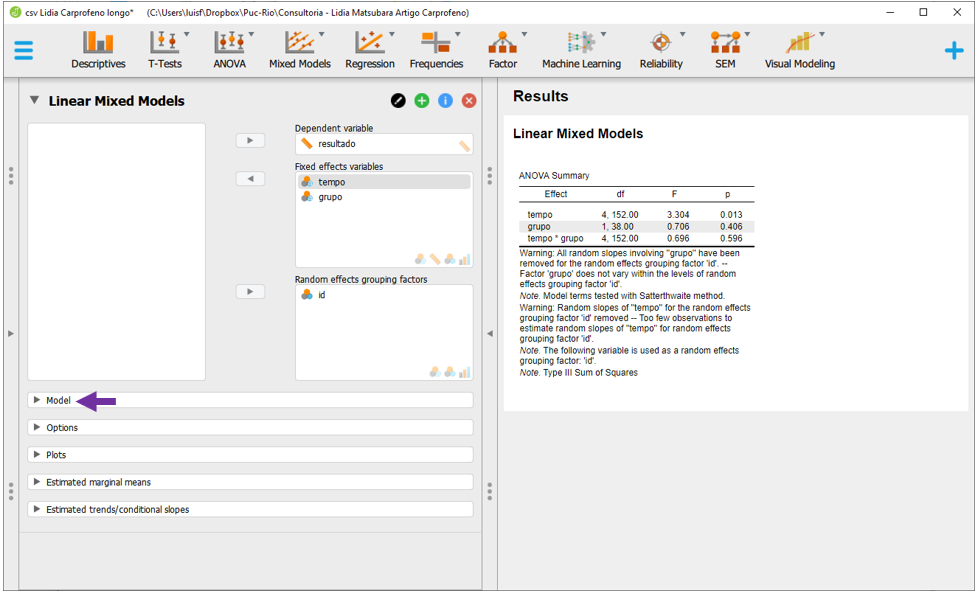 Esses resultados são baseados na configuração padrão do JASP, que define tanto o intercepto como a inclinação como efeitos aleatórios. No entanto, nesta pesquisa, apenas o intercepto foi definido como aleatório. Para alterar essa configuração, será necessário clicar na opção Model, na parte esquerda do programa.