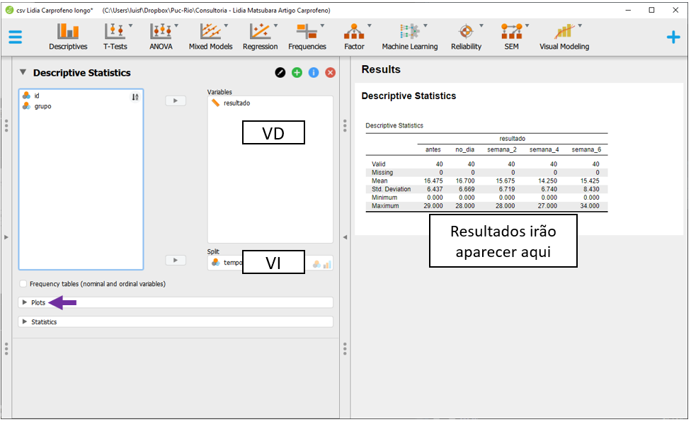 Gráficos permitem um entendimento mais facilitado dos resultados. Para fazer isso, será necessário clicar na opção Plots.