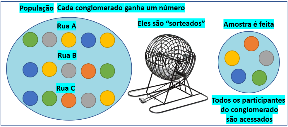 Neste tipo de amostragem, a população encontra-se localizada - naturalmente - em conglomerados. Estes conglomerados podem ser ruas, bairros ou empresas, por exemplo e são assumidos como heterogêneos. Os conglomerados recebem identificações que, por sua vez, são sorteadas. Todos os participantes dos conglomerados sorteados devem ser acessados.