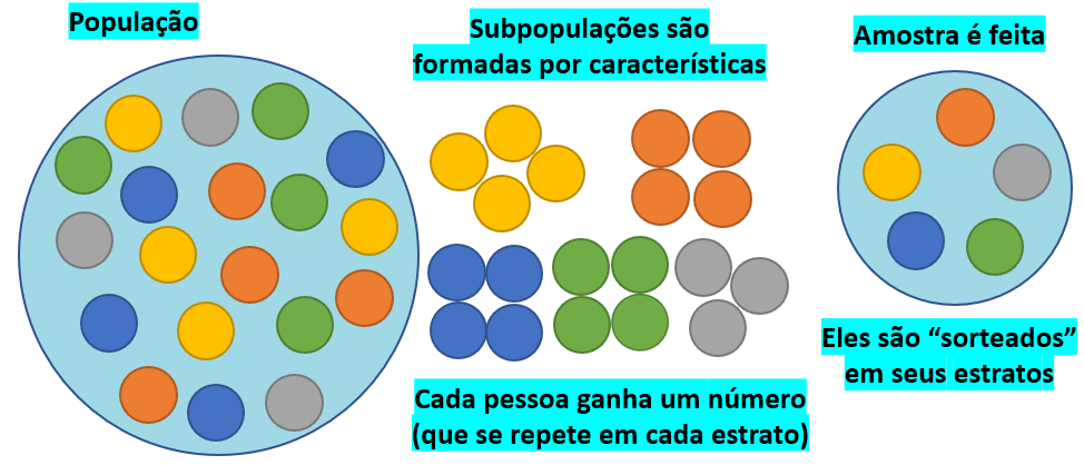 Neste tipo de amostragem, a população é dividida em subpopulações em função de características em comum, o que é chamado de estrato. Em seguida, cada participante recebe uma identificação dentro de seu estrato e o processo de amostragem aleatória simples é feito dentro em cada estrato. Atente que é possível que os participantes recebam os mesmos números. Por exemplo, se no estrato 1 há 100 pessoas, os números irão de 1 a 100 dentro deste estrato. Se no segundo estrato há também 100 pessoas, os participantes deste estrato também receberão números de 1 a 100. Com muita frequência, as características de interesse na população são desbalanceadas e, com isso, os estratos e a amostra também serão desbalanceados. Por exemplo, se há cerca de 80% de mulheres em uma determinada população, é esperado que a amostra tenha proporção similares de mulheres.