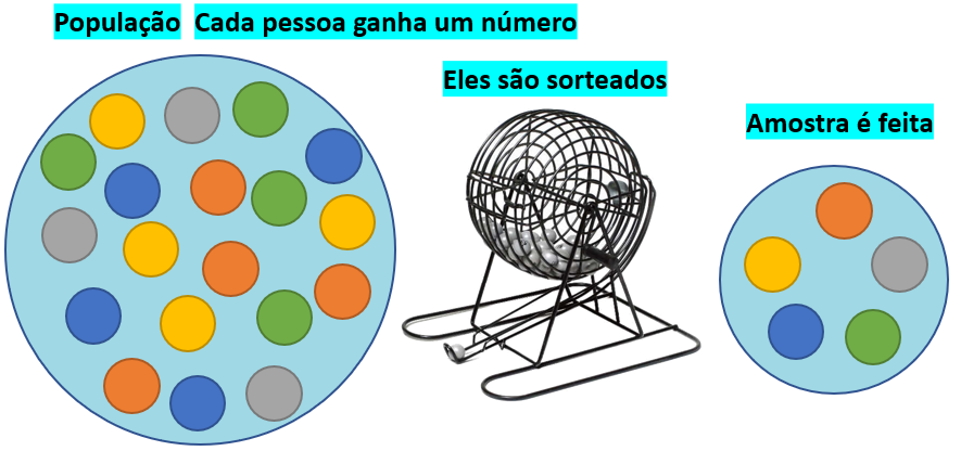 É o processo mais elementar. O método se fundamenta no princípio de que todos os membros de uma população têm a mesma probabilidade de serem incluídos na amostra. Para fazer este tipo de procedimento, cada participante da população “recebe” um número. Este número é sorteado em um procedimento que, as vezes, é chamado de loteria. A amostra é formada pelos participantes sorteados.
