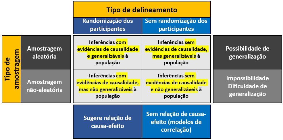 A imagem a seguir visa integrar os conceitos de amostragem, delineamento e generalização.