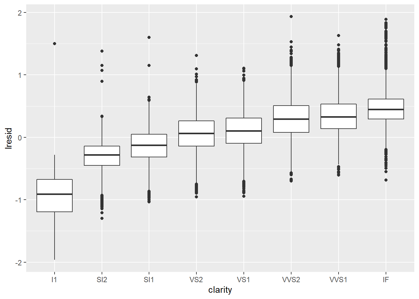 ggplot(diamonds2, aes(clarity, lresid)) + geom_boxplot()