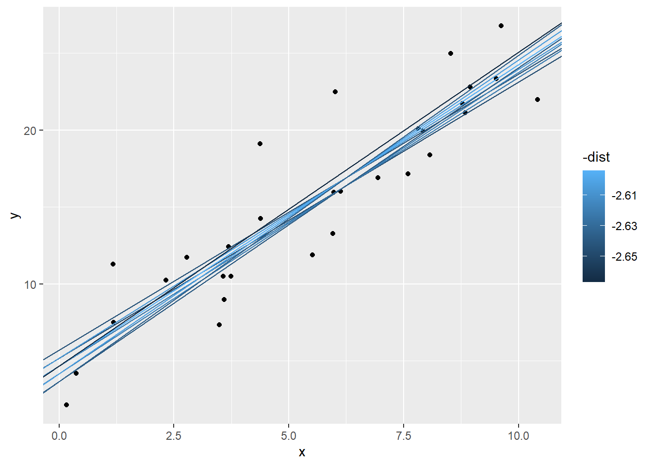 geom_abline(data = filter(grid, rank(dist) <= 10), aes(intercept = a1, slope = a2, col = - dist))