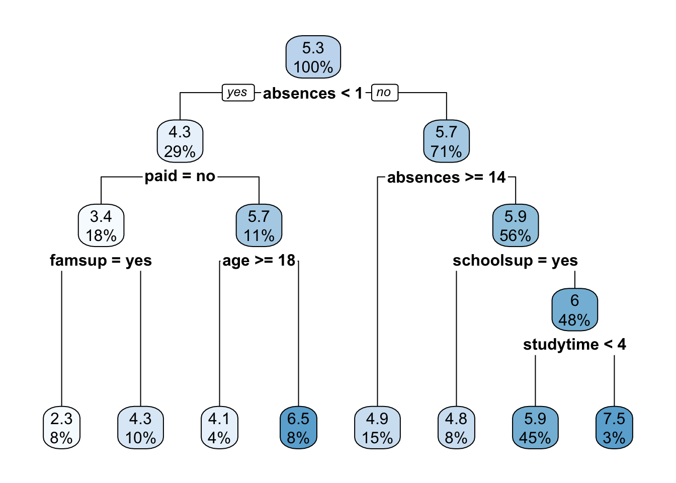 The function rpart.plot as different options about which information should be displayed. Here we use it with its default setting and each node provides the average grade and the percentage of observations in each node (with respect to the total number of observations). Note that basically all the numbers in the plot are rounded.