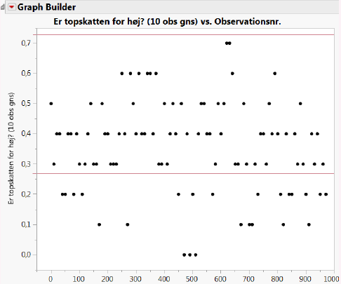 Hvis vi bruger de første \(n\) =10 personers svar som grundlag for at beregne et estimat af \(\hat p\), finder vi at \(\hat p=0,\!5\).