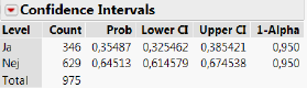 I praksis er der naturligvis ikke nogen grund til ikke at anvende hele datasættets 975 observationer til beregning af \(\hat p\). I det tilfælde finder vi at \(\hat p=346/975\) = 35,5%, og dermed at eksempelvis et 95%-konfidensinterval for \(p\) er givet som