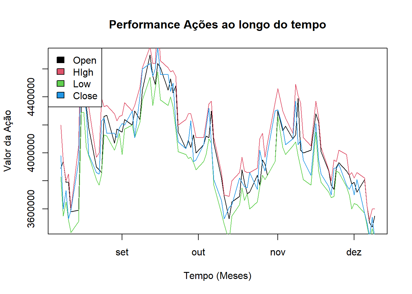 plot(x=dfAcoes$Date, y= dfAcoes$Open, type = "l", xlab = "Tempo (Meses)", ylab = "Valor da Ação", main = "Performance Ações ao longo do tempo")