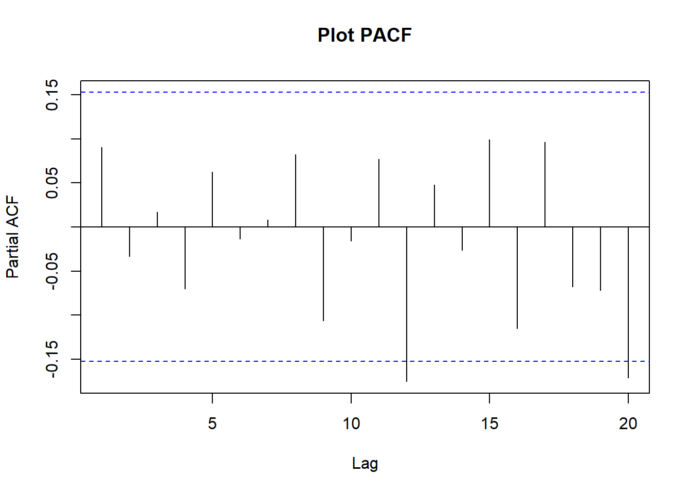 Tidak ada autokorelasi yang berbeda signifikan dari nol di lag sampai 20. Jika ditambah sampai lag yang sangat banyak: