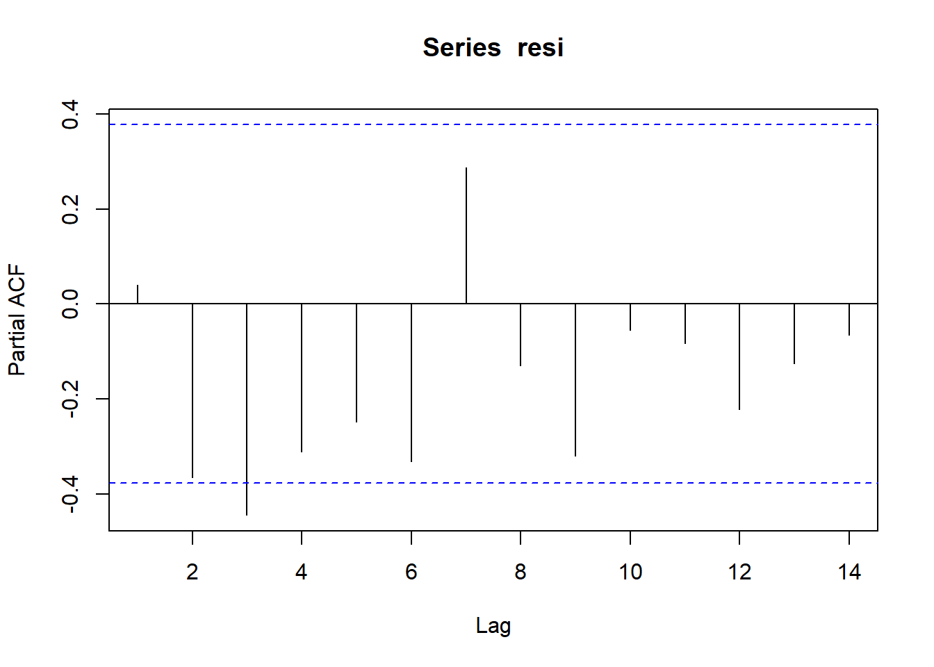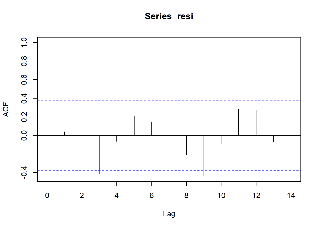 Atau, dapat digunakan uji Breusch-Godfrey. Pada dasarnya, dilakukan regresi residual dengan peubah bebas dan residual lag sebelumnya, lalu dihitung \(R^2\). Secara asimptotik, \(nR^2\sim\chi^2_{p}\). Implementasi uji tersebut di R:
