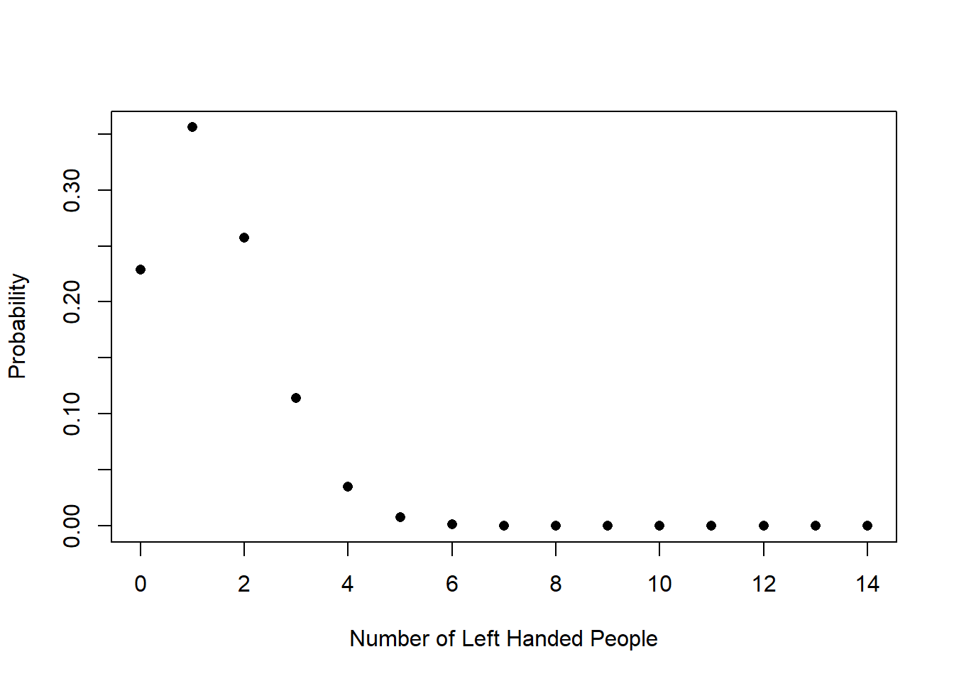 plot(0:14,dbinom(0:14, 14, prob=.1), pch=16, xlab="Number of Left Handed People", ylab="Probability")
