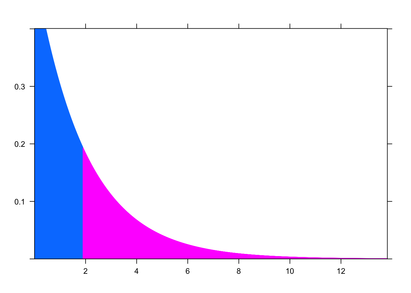 plotDist("chisq", df=2, groups = x > 1.9, type="h")