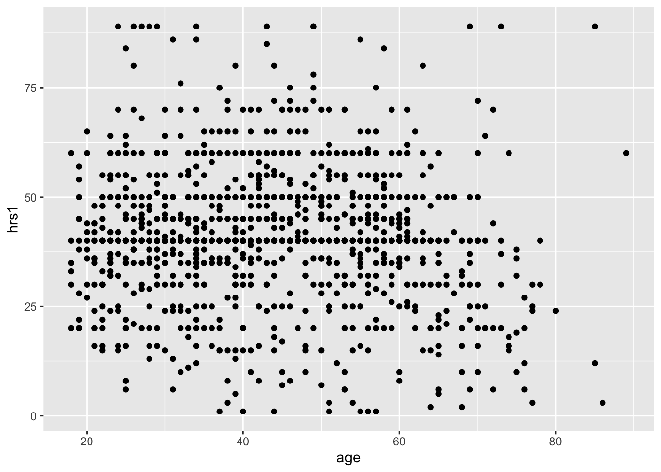 gss <- gss %>% ungroup()Now we can use geom_point, instead of bar, to plot the relationship between age and hours worked last week (hrs1).