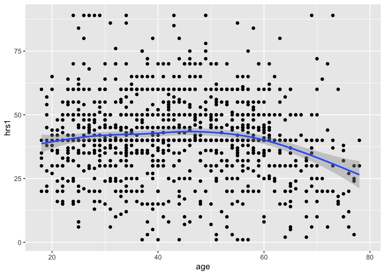 ggplot(data = gss, aes(x = age, y = hrs1)) +