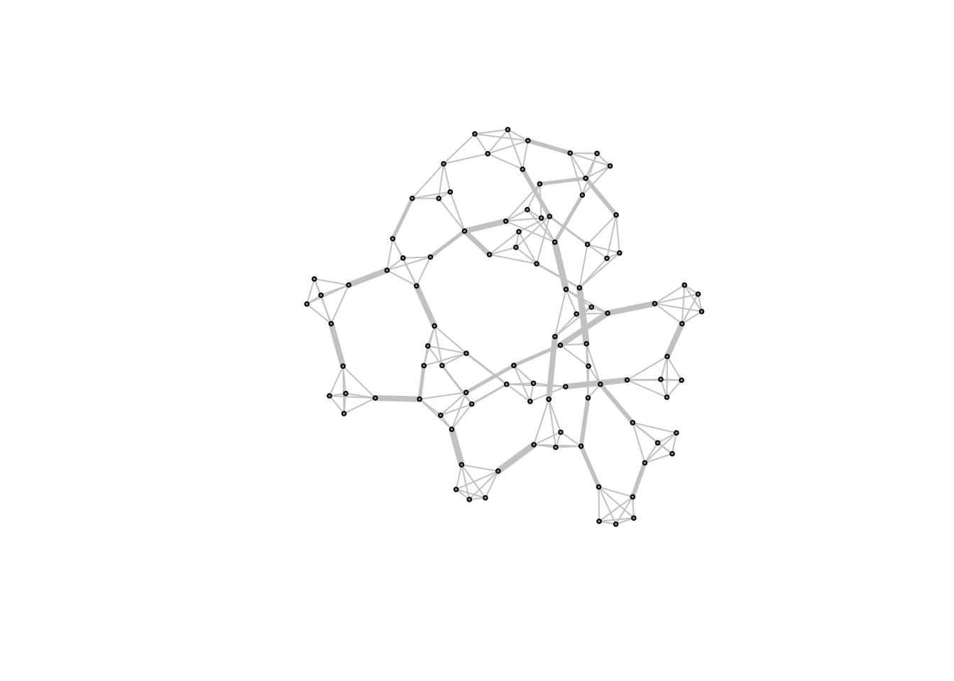 plot(caveman_net, layout = layout.kamada.kawai(caveman_net), vertex.size = 2, vertex.label = NA, vertex.color = "grey80")