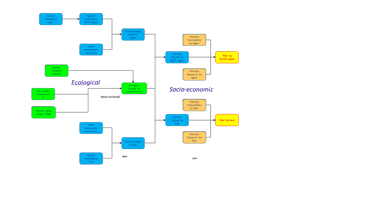 Both of these sectors are at risk from the impacts of climate change on the living marine resources upon which they depend. The biological impacts therefore form the base of this analysis (Figure xxx) and we consider two different mode of biological response. Firstly, species-specific harzards arise due to the inherent traits of the organism that can make it more, or less, sensitive to climate change. Secondly, the response also depends on the spatial context: a population of a given species that is close to its physiological upper thermal limit will be much more sensitive to warming than a population that is in the middle or colder part of its range. The combination of species-level information with the spatial context allows us to calculate the stock- (or population-) specific hazards that form the basis of this analysis.