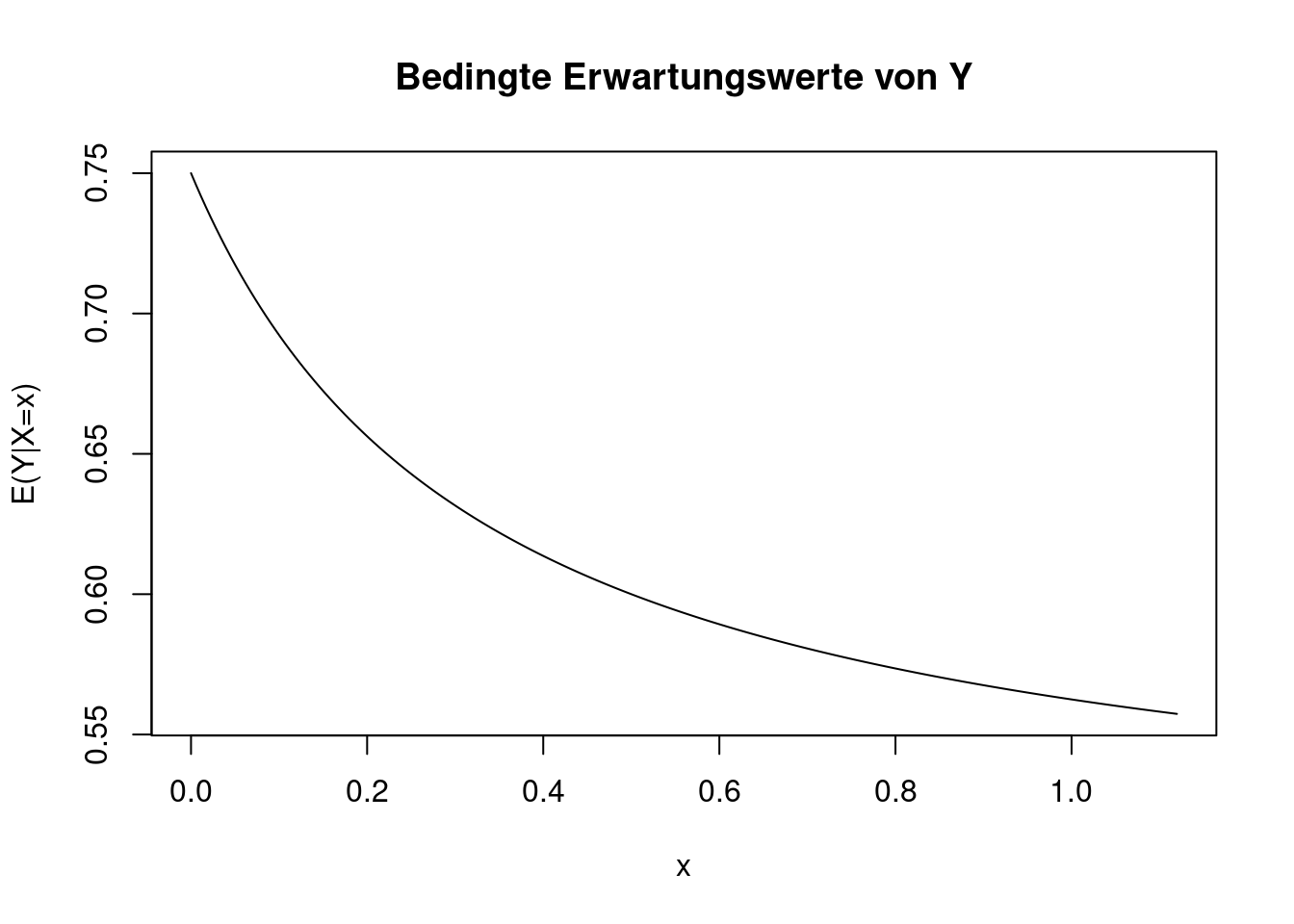 Der Erwartungswert von \(Y\) ist also bei kleinen Werten von \(x\) größer als bei großen Werten. Wenn bekannt ist, dass \(X\) den Wert 1 annimmt, dann erwartet man für \(Y\) im Mittel ungefähr den Wert 0.55. Ist \(X\) dagegen nur knapp über 0, dann erwartet man im Mittel für \(Y\) fast 0.75.