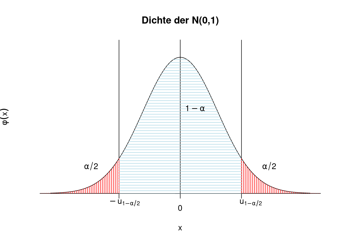 \] wobei \(u_{1-\alpha/2}\) das \((1-\alpha/2)\)-Quantil der \(N(0,1)\) ist. Die Wahrscheinlichkeit, dass eine standardnormalverteilte Zufallsvariable kleiner (oder gleich) \(u_{1-\alpha/2}\) ist, beträgt also per Definition des Quantils gerade \(1-\alpha/2\). Wegen der Symmetrie ist die Wahrscheinlichkeit, dass eine standardnormalverteilte Zufallsvariable kleiner ist als \(-u_{1-\alpha/2}\) gerade \(\alpha/2\) (vgl. Kapitel 4.3.1). Zusammengenommen ist also die Wahrscheinlichkeit, zwischen den beiden Grenzen zu liegen gerade \(1-\alpha/2-\alpha/2=1-\alpha\), wie die folgende Abbildung zeigt. Die beiden äußeren, rot schraffierten Flächen stehen jeweils für eine Wahrscheinlichkeit von \(\alpha/2\). Die hellblau schraffierte Fläche steht für eine Wahrscheinlichkeit von \(1-\alpha\).