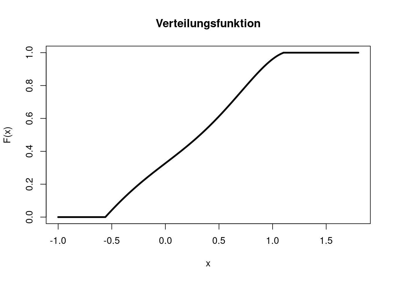 Die folgende Abbildung zeigt die Verteilungsfunktion einer Zufallsvariablen \(X\). Hier und bei den folgenden Abbildungen im Rest dieses eLehrbuchs können Sie den R-Code, mit dem die Grafiken erzeugt werden, aufklappen. Er wird jedoch nicht näher erklärt und ist zum Verständnis des Inhalts auch nicht notwendig.