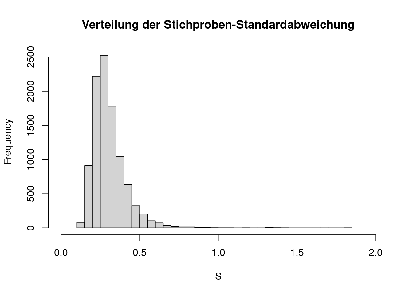 \] ist eine Statistik, da sie aus den \(n\) Stichprobenelementen errechnet wird. Es handelt sich bei \(S\) folglich um eine Zufallsvariable. Wie ist \(S\) verteilt, wenn die Population \(X\) einer Paretoverteilung mit den Parametern \(x_{min}=1\) und \(k=5\) folgt und wenn eine Stichprobe vom Umfang \(n=50\) gezogen wird? Das lässt sich leicht durch eine Monte-Carlo-Simulation herausfinden. Die Dichte von \(S\) kann durch ein Histogramm sehr vieler Realisationen von \(S\) ermittelt werden, z.B. \(R=10000\). In jedem Simulationsdurchlauf wird eine Stichprobe x vom Umfang \(n=50\) aus der Paretoverteilung (mit den gegebenen Parametern) gezogen und die Stichprobenstandardabweichung sd(x) für diese Stichprobe berechnet und in einen Vektor S geschrieben. Der Vektor wird vor dem Schleifenstart initialisiert, z.B. durch die rep-Funktion. Für die Ziehung einer Stichprobe aus der Paretoverteilung aktivieren wir das Paket distributionsrd. Das Paket stellt die Funktion rpareto zur Vefügung.