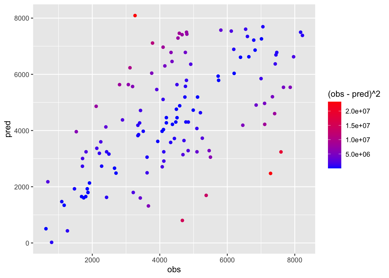 geom_point(aes(x=obs,y=pred,col=(obs-pred)^2)) +