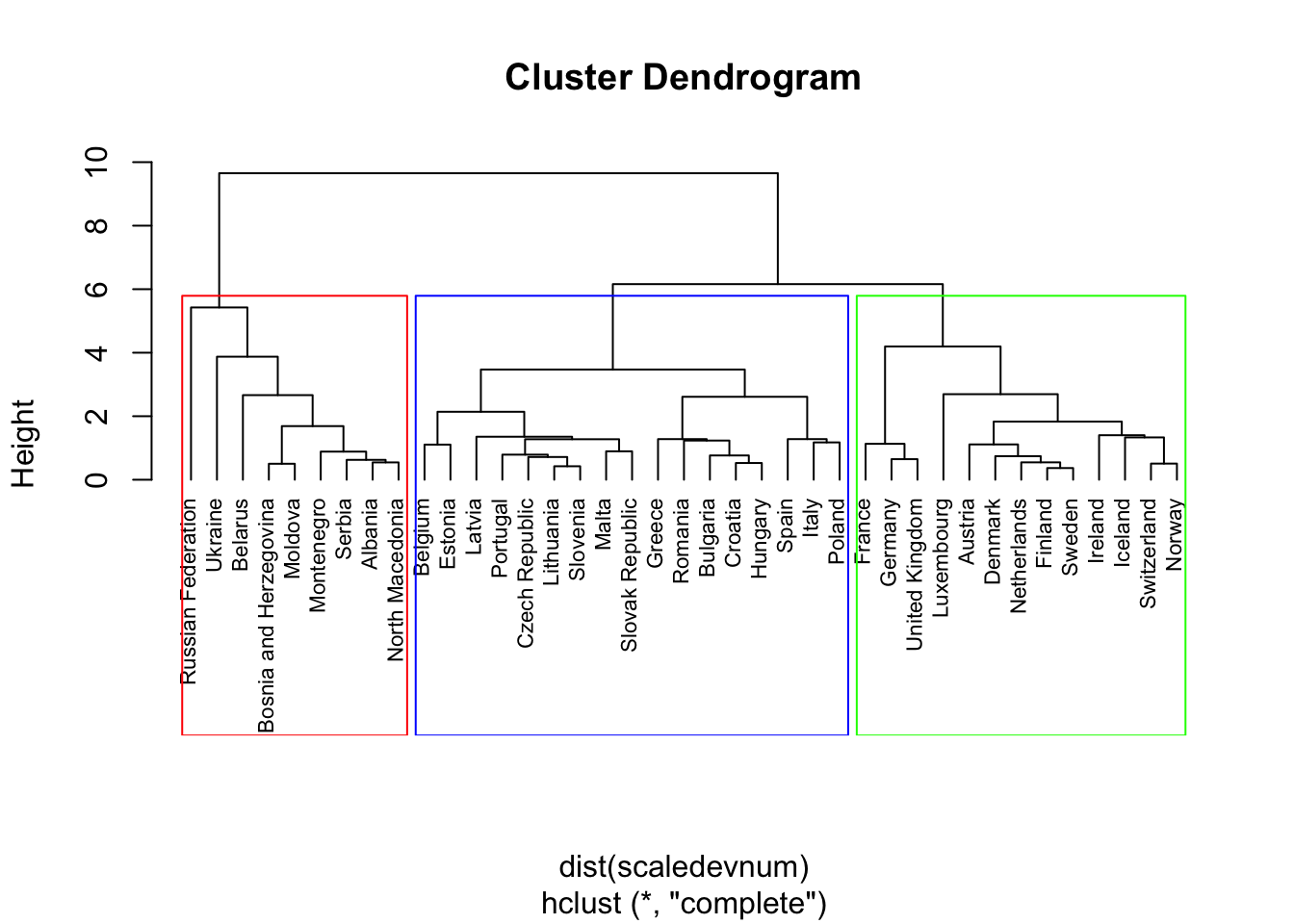 The first cluster, containing 13 countries, is the green in the dendrogram. The second cluster is composed by 25 countries including Italy (it’s the blue one). The last one is a singleton containing only the Russian Federation.