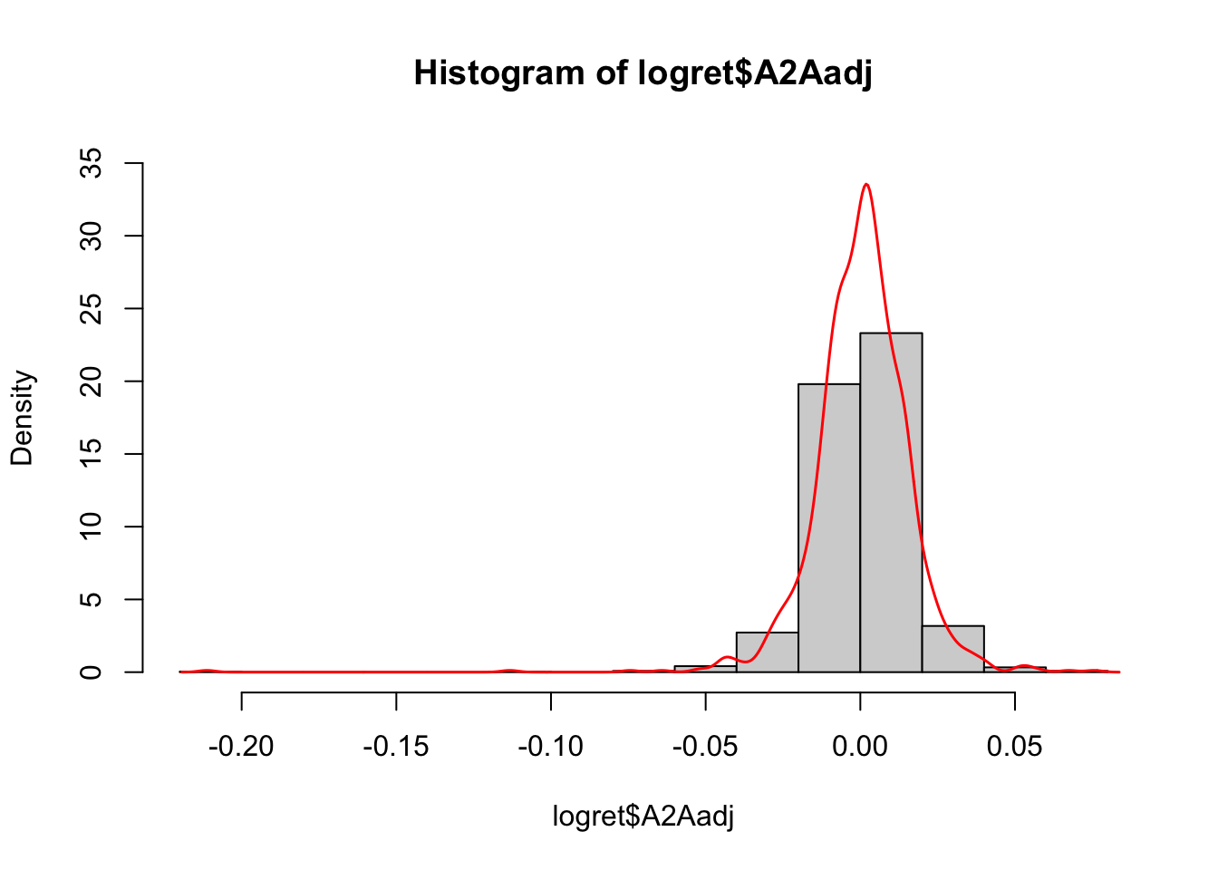 hist(logret$A2Aadj, freq = F, ylim = c(0,35))