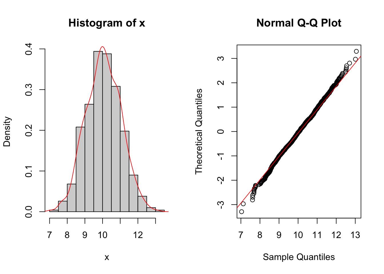 The plot represent the well-known bell-shaped distribution of the Normal model. Moreover the Normal probability plot shows how the theoretical quantile and the empirical quantile lies on a straight line