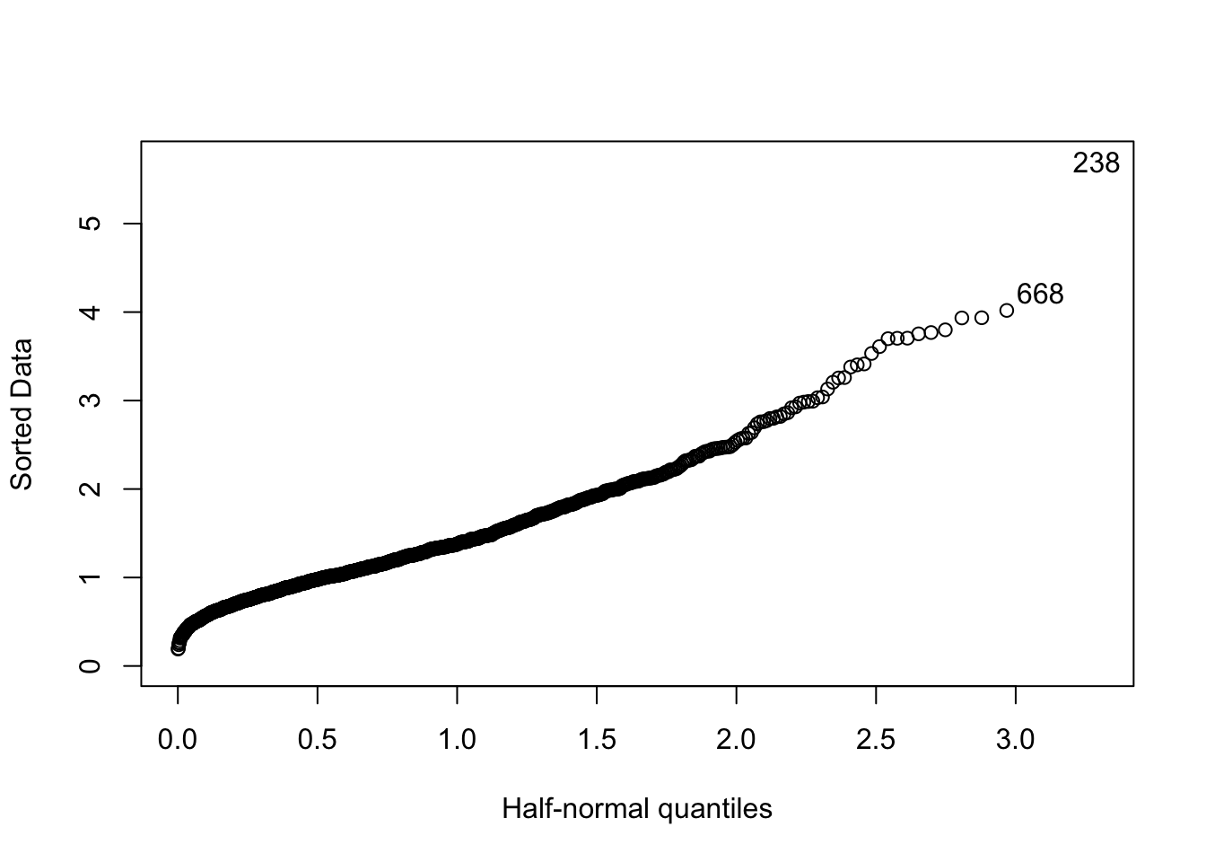 On the x-axis of the quantiles of the half-Normal distribution \(|Z|\) are reported (given by \(\Phi^{-1}\left(\frac{n+i}{2n+1}\right))\) where \(i=1,\ldots,n\)). On the y-axis instead the ordered sample data in absolute value are used. In the plot the observations with index 205 and 238 are considered extreme with respect to the half-Normal distribution; the corresponding values can be retrieved as follows: