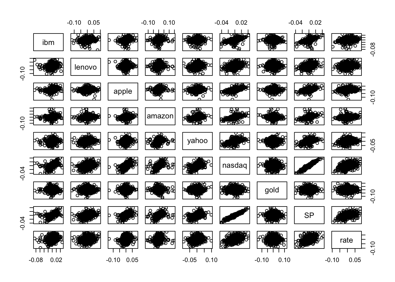 cor(datareg) #correlation matrix## ibm lenovo apple amazon yahoo nasdaq
