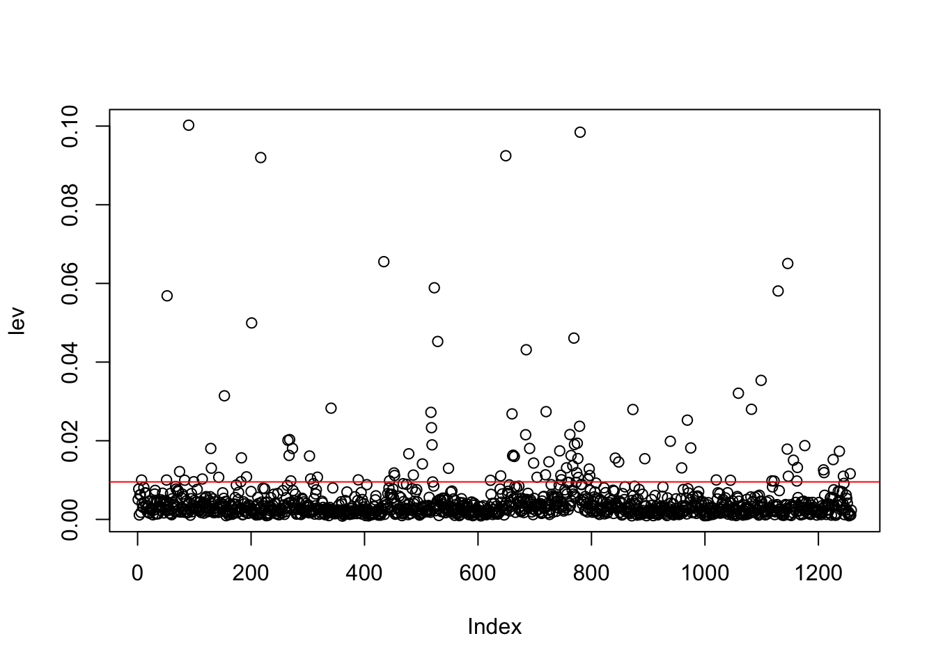 Let’s compute the leverage value for all the observations under analysis by using the function hatvalues:
