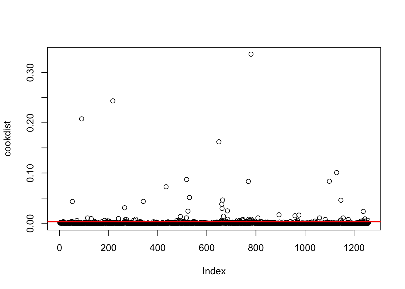 cookdist = cooks.distance(mod1)The plot, including the threshold, can be obtained by using the following code: