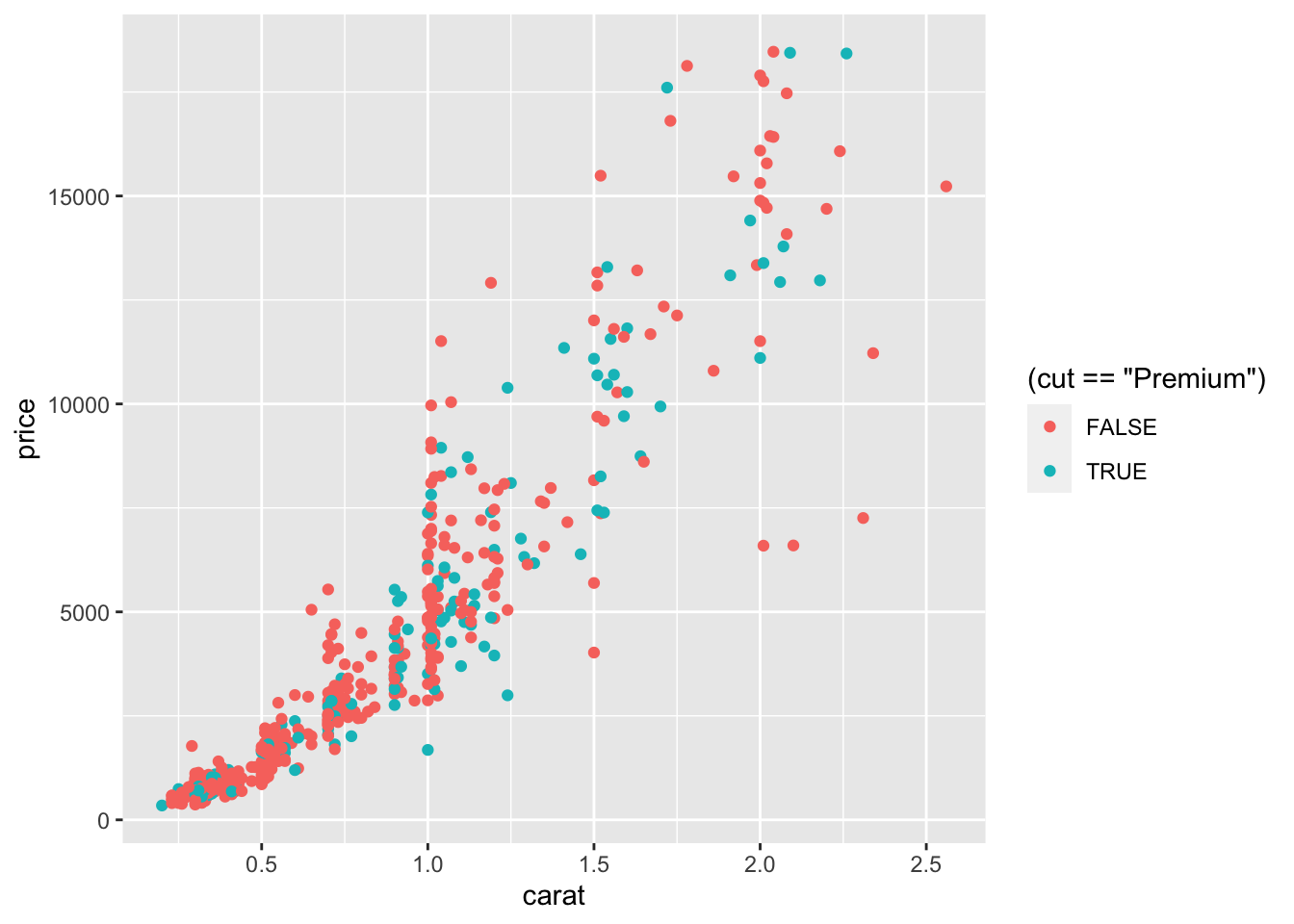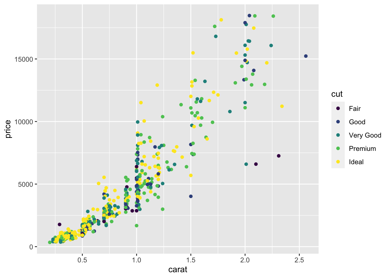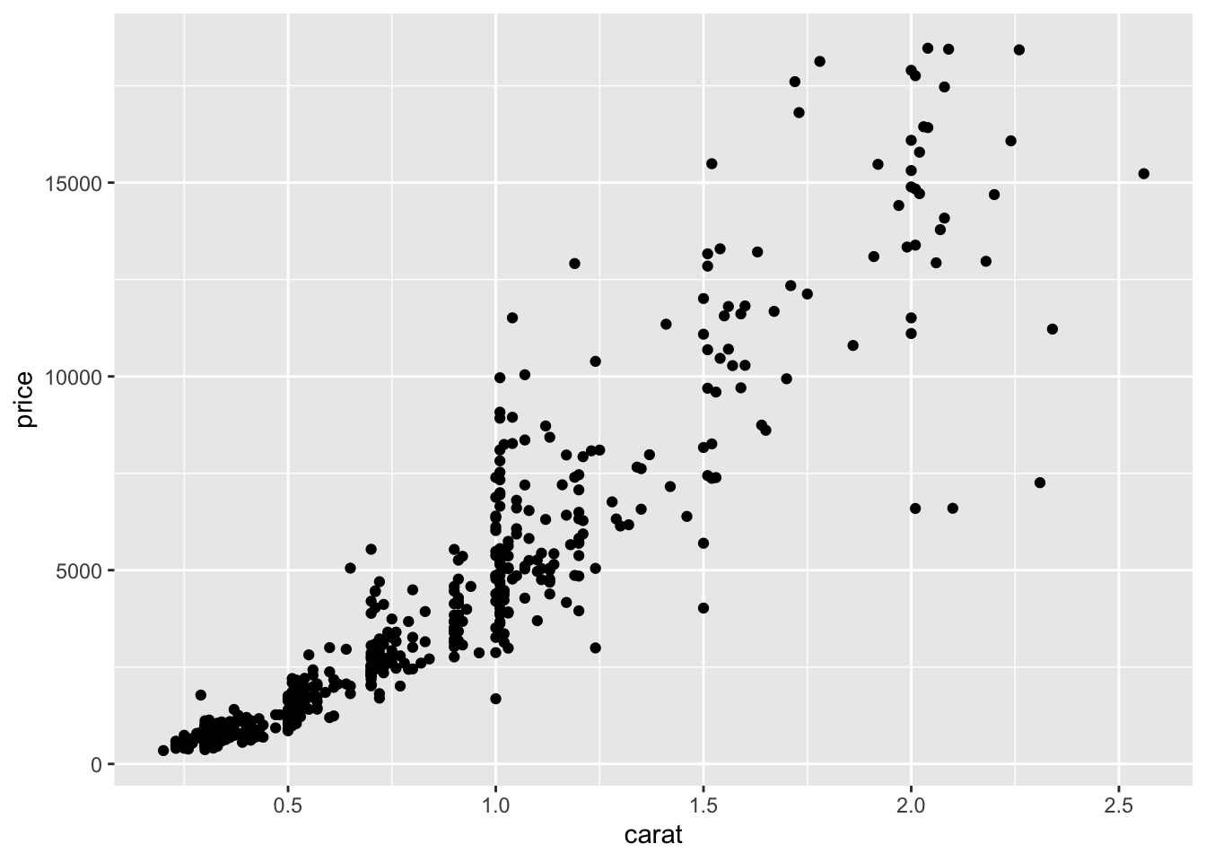 We begin with a scatterplot displaying price on the y-axis and carat on the x-axis; the necessary geometry is implemented with geom_point: