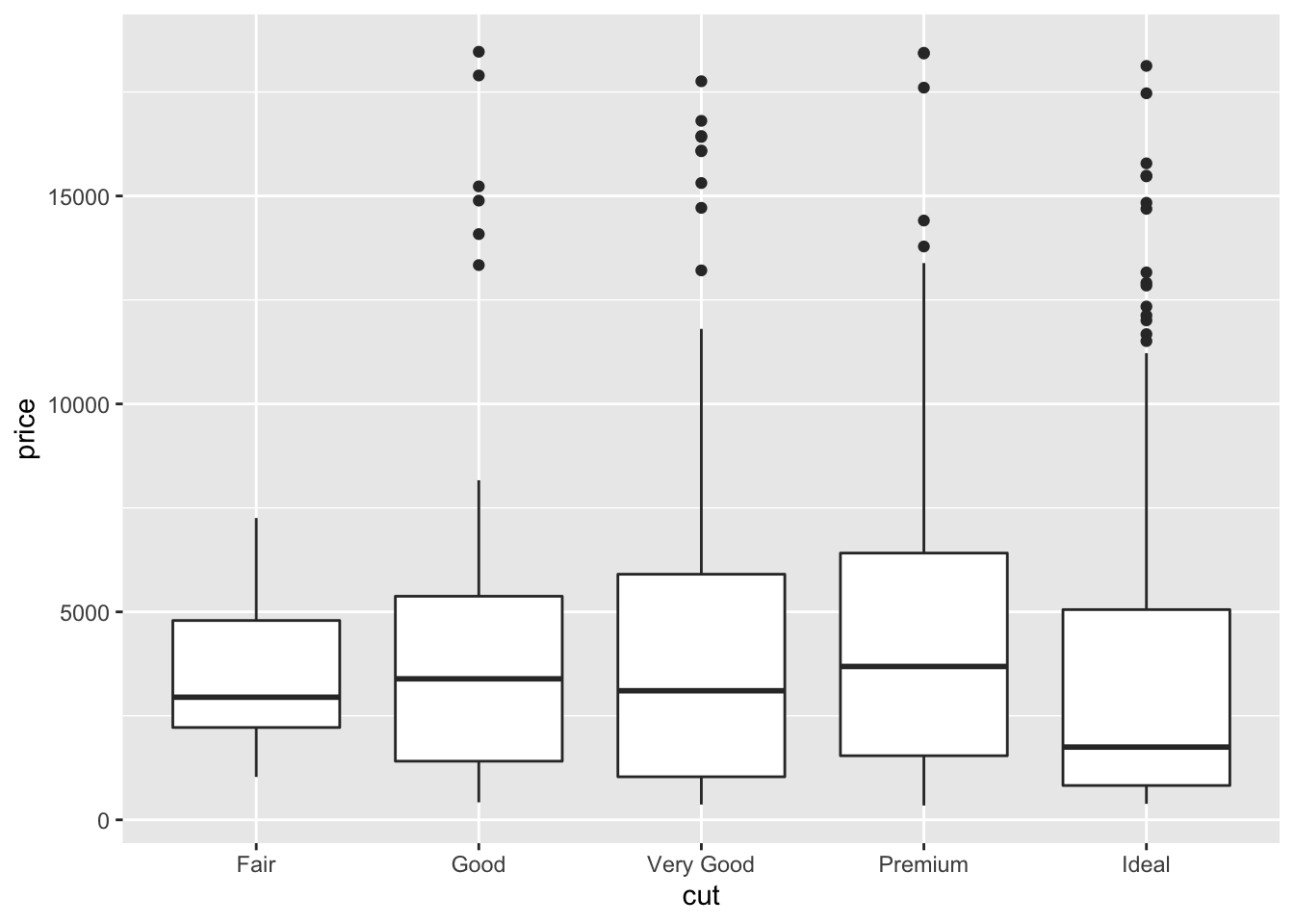 The boxplot can be used to study the distribution of a quantitative variable (e.g. price) conditioning on the categories of a factor (e.g. cut). It can be obtained by using the geom_boxplot geometry, where x is given by the qualitative variable: