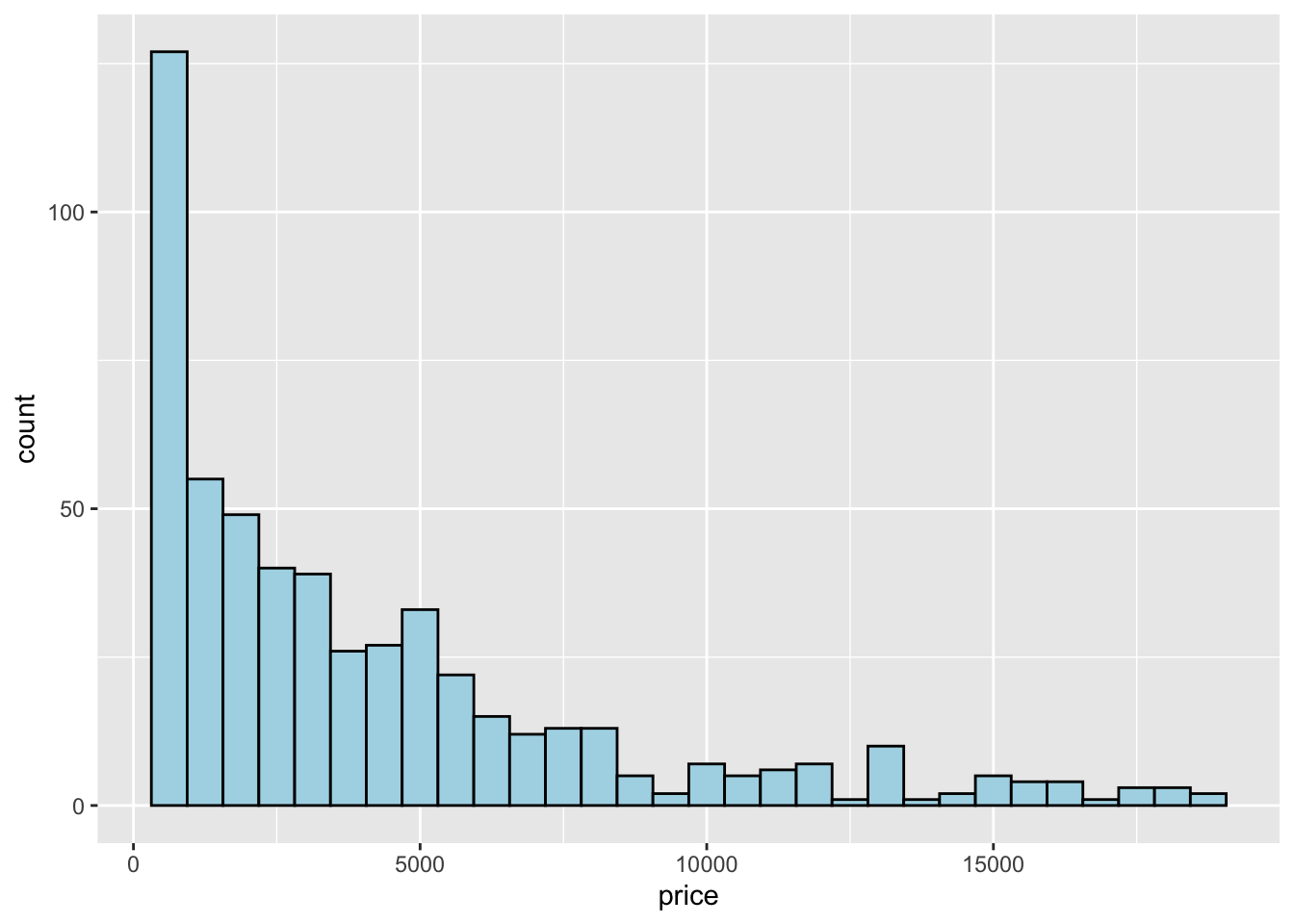 Note that in this case we need to specify only the x variable, while the y is computed automatically by ggplot and corresponds to the count variable (i.e. how many observations for each class of price values). This is given by the fact that every geometry has a default stat specification. For the histogram the default computation is stat_bin which uses 30 bins and computes the following variables: