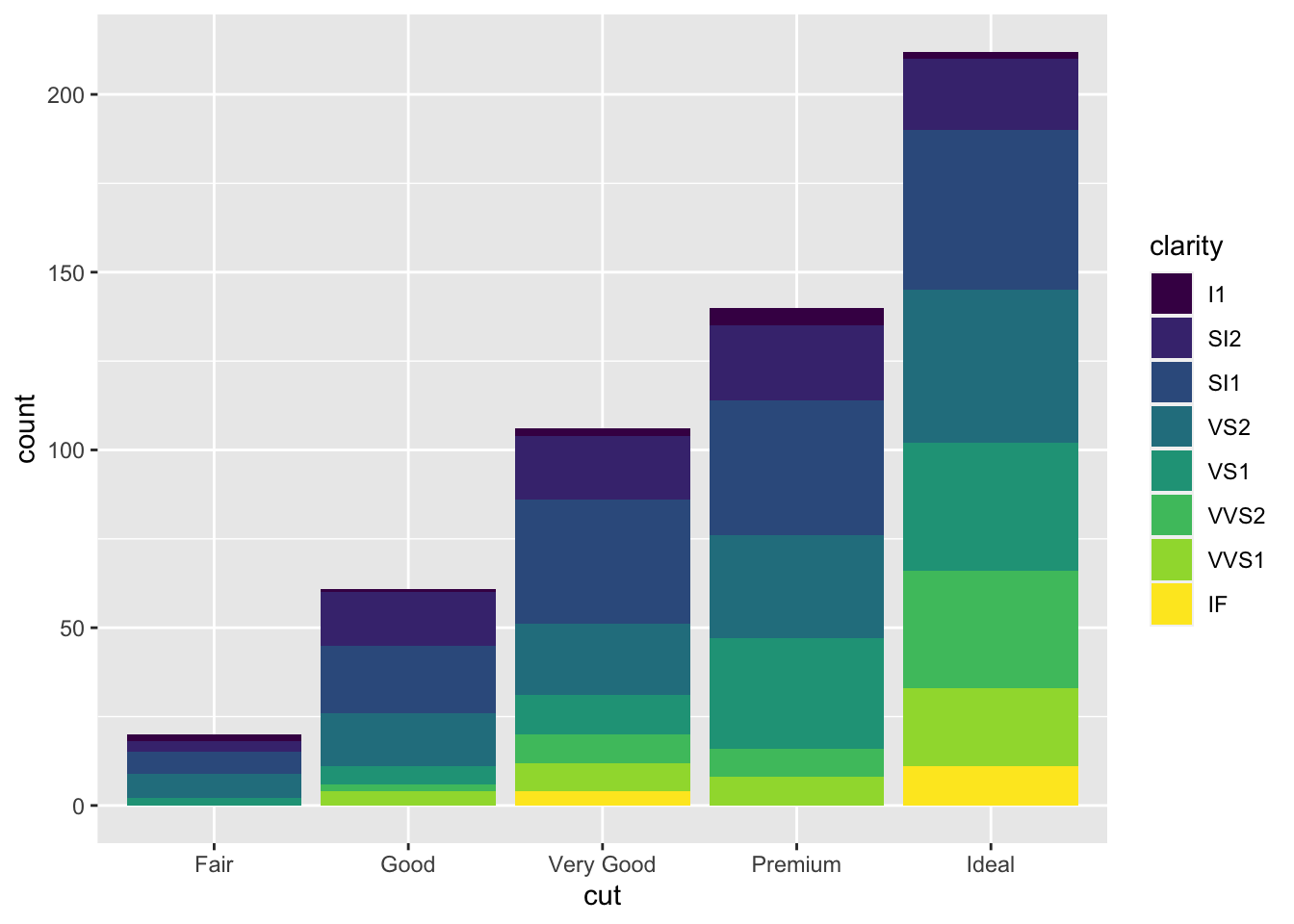 Note that the bars are automatically stacked and each colored rectangle represents a combination of cut and clarity. The stacking is performed automatically by the position adjustment given by the position argument (by default it is set to position = "stack"). Other possibilities are "dodge" and "fill":