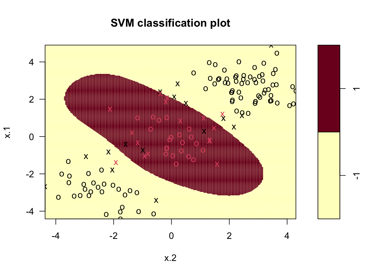 In the figure we see the training observations represented by different colors: red symbols belong to the category +1, while black symbols to the category -1. Crosses (instead of circles) are used to denote the support vectors. Finally the background color represents the predicted category: the red area defines the values of the regressors for which the prediction of y is equal to +1. Elsewhere (in the yellow area) the prediction will be given by category -1. The option grid of the plot function improves the resolution of the prediction areas (the higher the value, the higher the resolution).