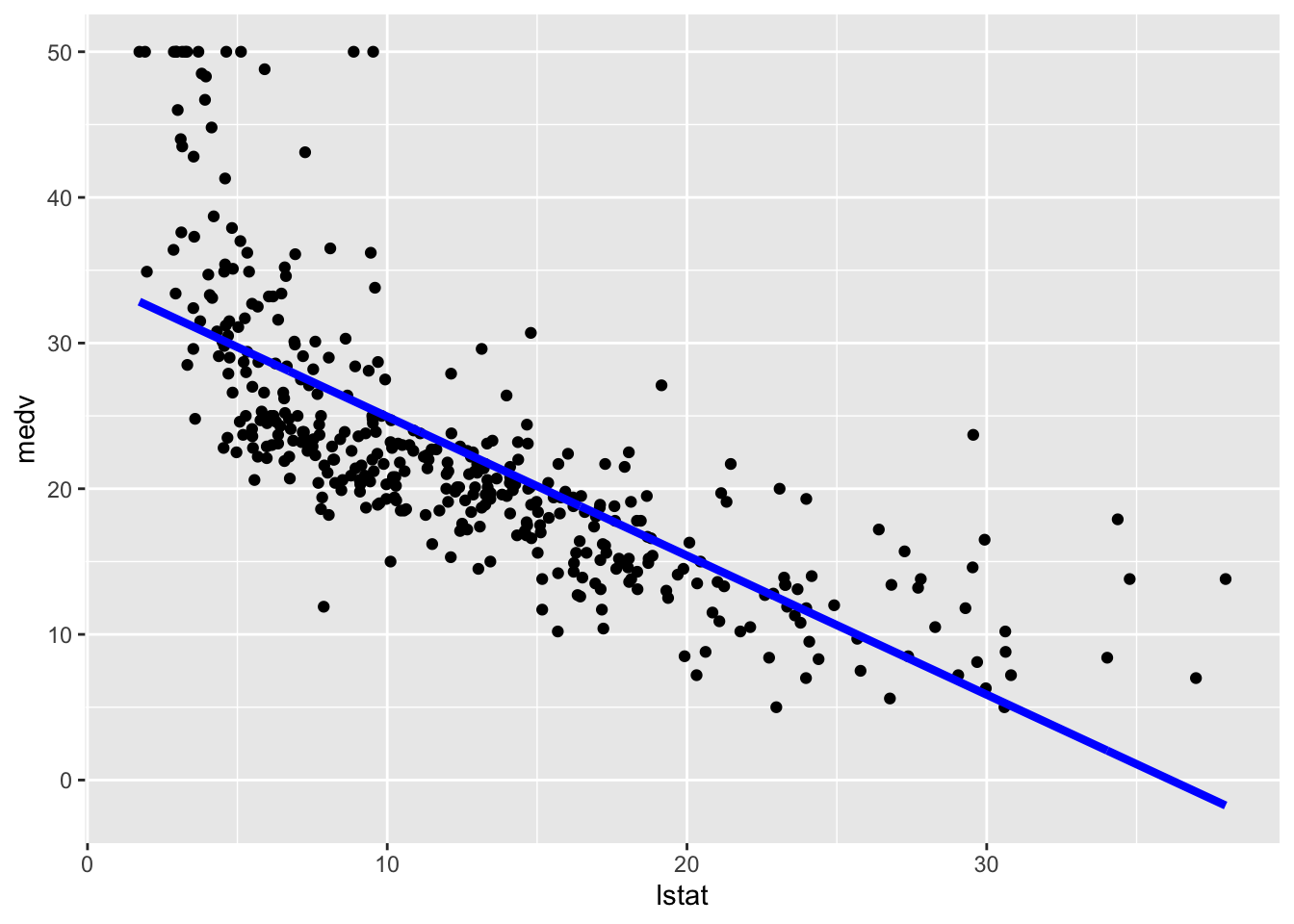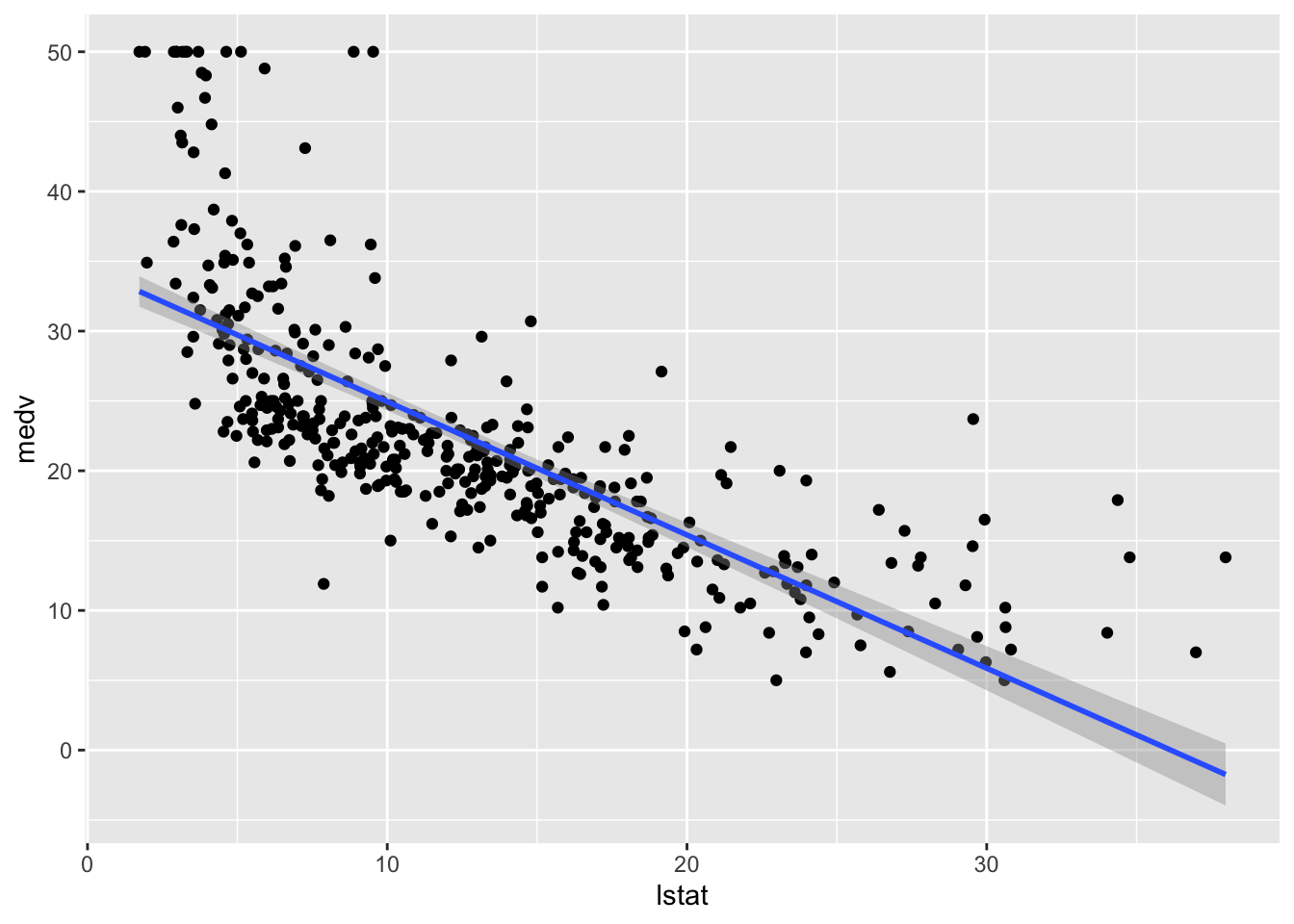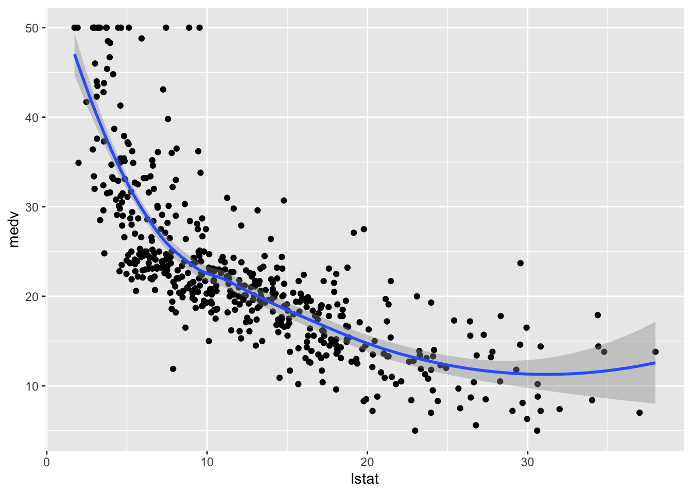 We consider lstat (lower status of the population (percent)) as regressor/covariate and medv (median value of owner-occupied homes in $1000s) as response variable. The relationship between the two variables is shown in the following plot:
