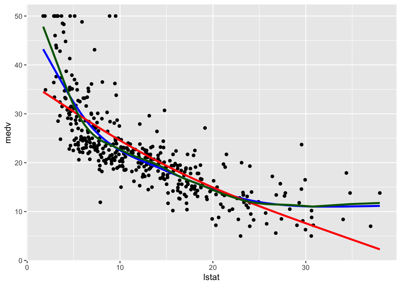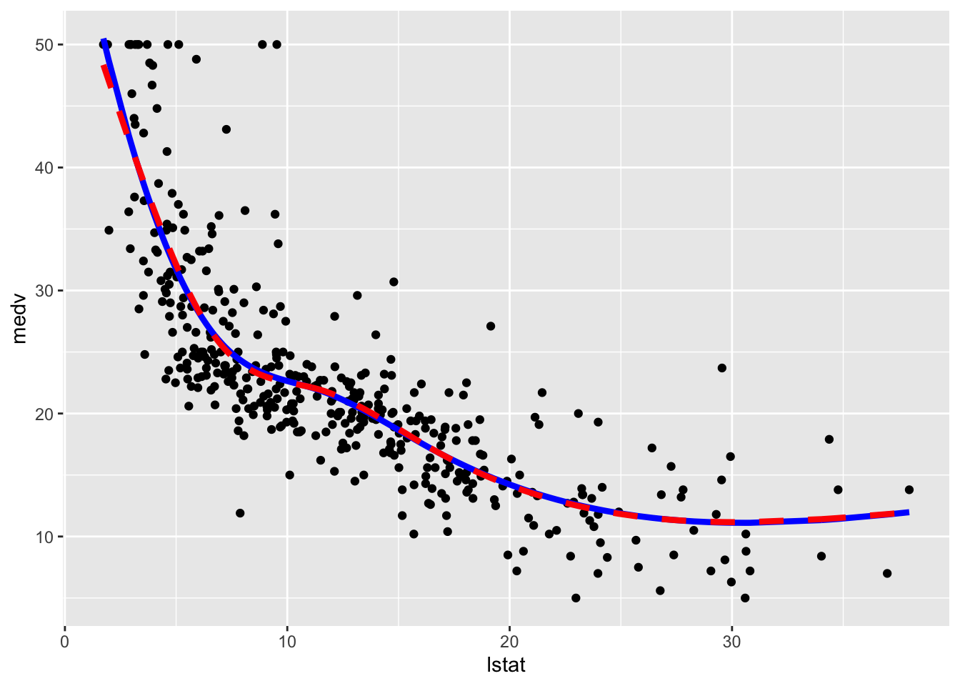 We plot the fitted model with the two methods. Note that for using geom_smooth it is necessary to specify by means of formula that we are using a transformation of x=lstat: