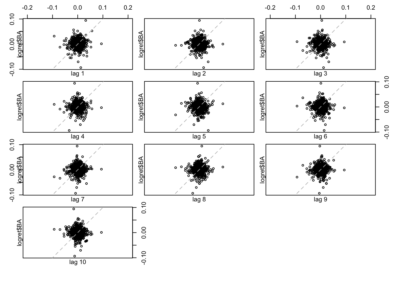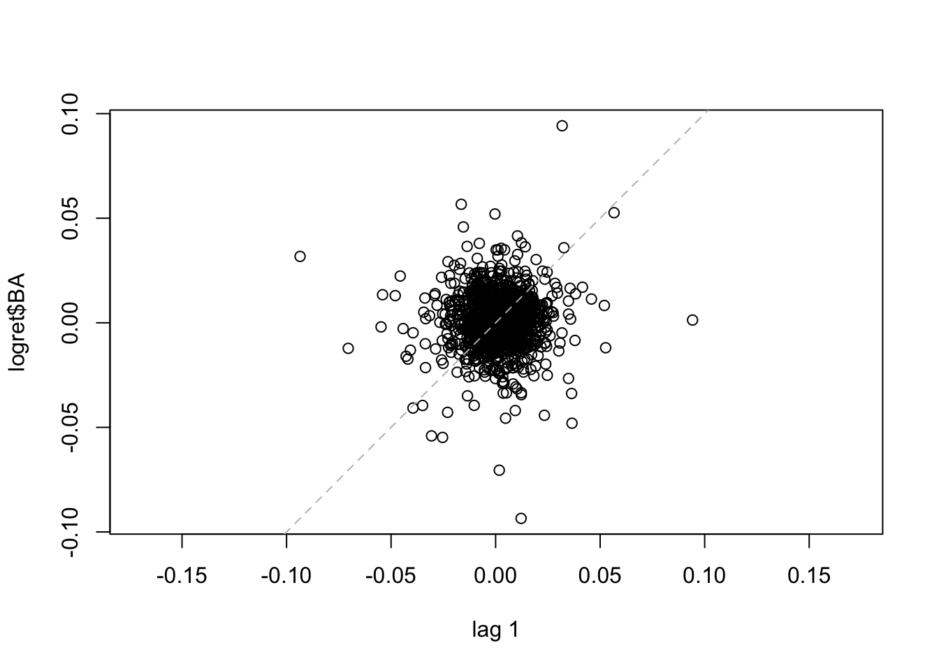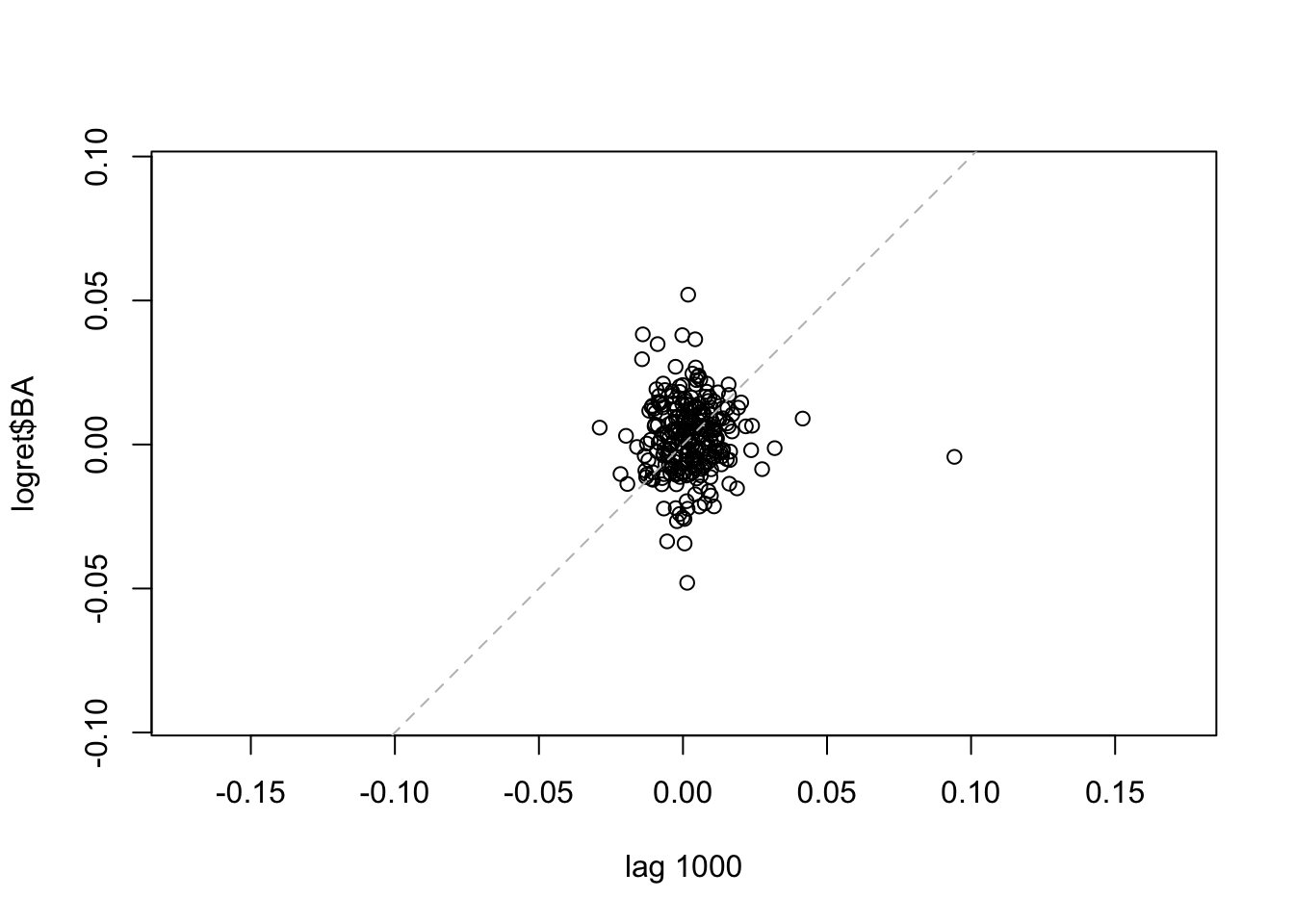 La linea tratteggiata nel grafico rappresenta l’intercetta. Si osserva che i punti sono dispersi nei quattro quadranti del grafico, sintomo di una correlazione debole. Lo stesso grafico può essere ottenuto, per esempio, per il caso di \(h=2\) (per rappresentare \(y_t\) vs \(y_{t-2}\) per \(t=3, \ldots,\) 1258) ), 500 and 1000.