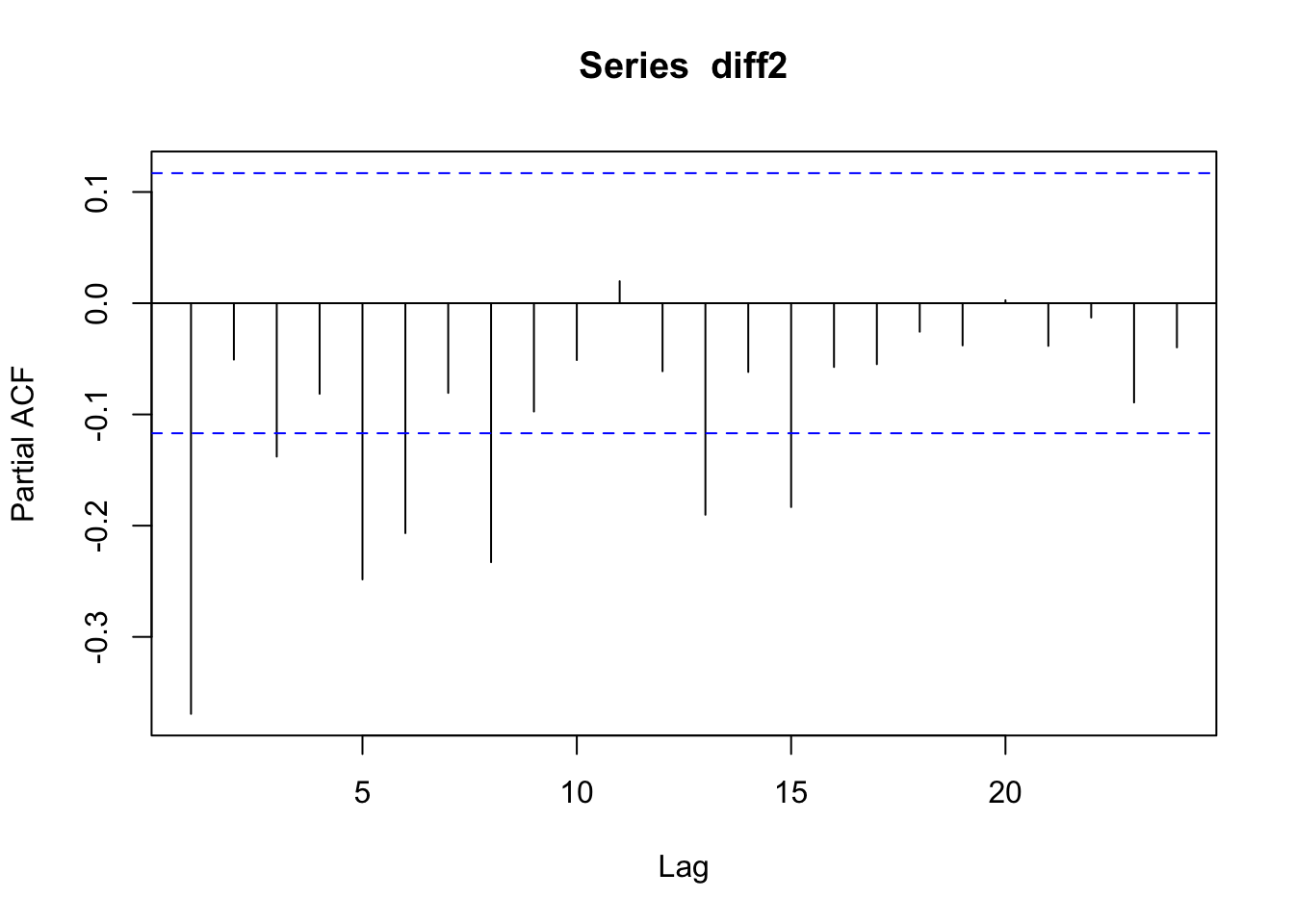 adf.test(diff2, alternative = "stationary")## Warning in adf.test(diff2, alternative = "stationary"): p-value smaller than