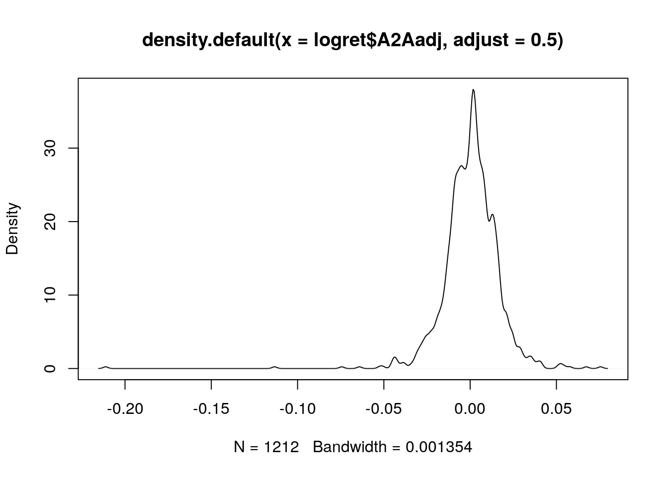mean((logret$A2Aadj - mean(logret$A2Aadj ))^3) / sd(logret$A2Aadj )^3## [1] -2.206542