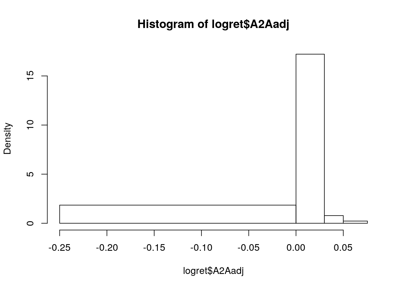 hist(logret$A2Aadj, plot = FALSE)## $breaks