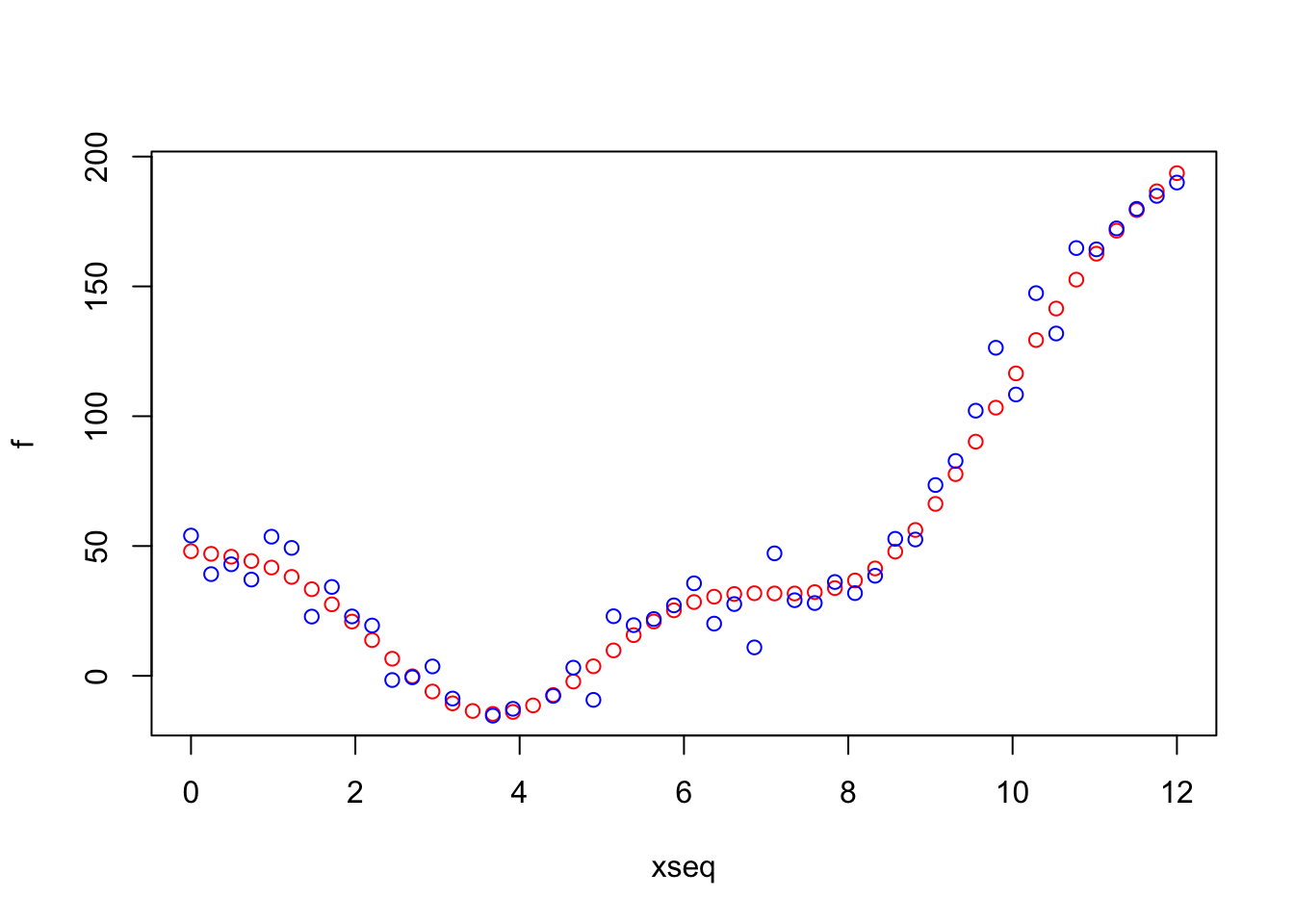 The function plot creates the graphical device while points adds some points to an already existing graphical window (remember that your blue points will be different!). The red points represent the true function \(f\) while the blue points are the training data which include some random variation given by \(\epsilon\).