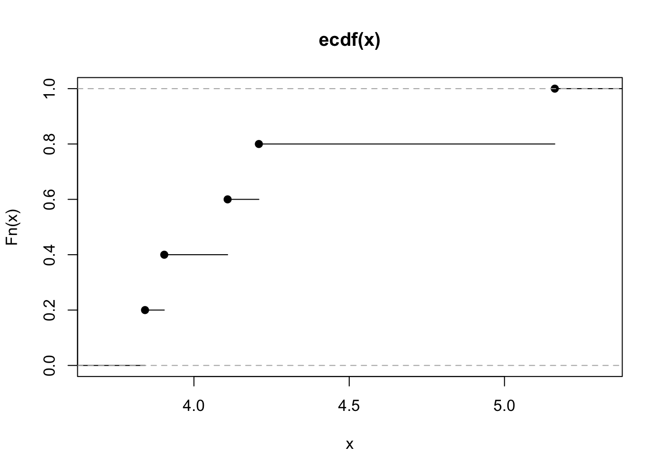 Note that the input of the myecdf function can be any real number. For the considered example the ecdf is equal to 0 for values lower than the lowest observed value (3.84) and equal to 1 for values bigger than the largest observed value (5.16). As expected, if we evaluate the ecdf in the median value we get 50% (for the definition of median):