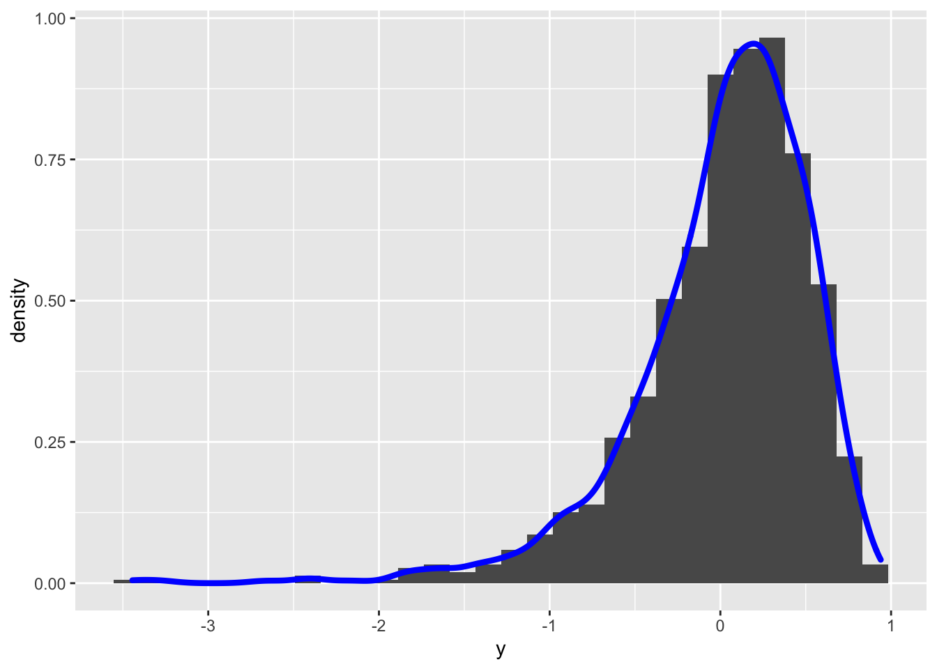 geom_density(aes(y), col="blue", lwd=1.5) ## `stat_bin()` using `bins = 30`. Pick better value with `binwidth`.